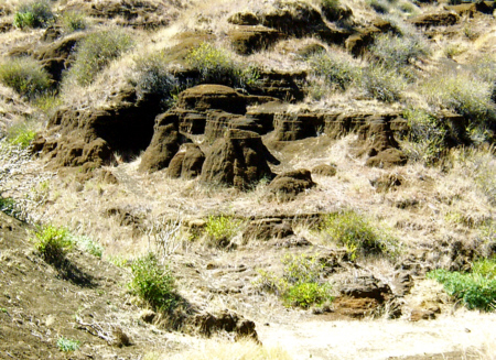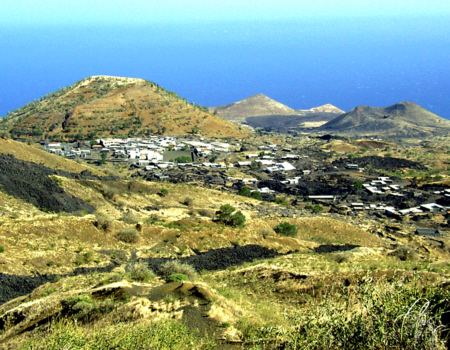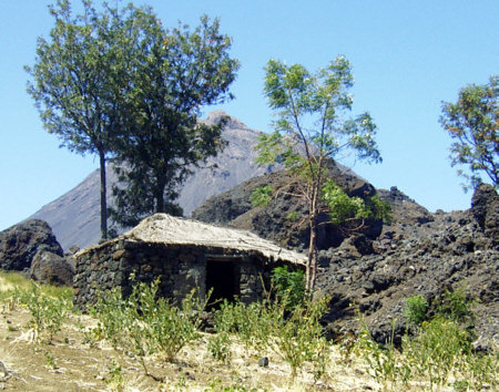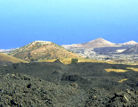 Es geht weiter über einen sandigen Abhang zu einem zweiten Lavafeld, auf dem der Pfad teilweise befestigt ist.